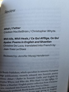 Included is my article reviewing two new Scottish poetry collections: “Athair / Father” by Crìsdean MacIlleBhàin / Christopher Whyte and “Whit ails, whit heals / Ce qui afflige, ce qui apaise: Poems in English and Shaetlan” by Christine De Luca. Both are published by Francis Boutle, a great publisher who specialise in minority languages. Christopher Whyte’s collection is in Gaelic and English, and Christine De Luca’s collection is in English and Shaetlan, with French translations. I highly recommend both books – read my review to find out the details!