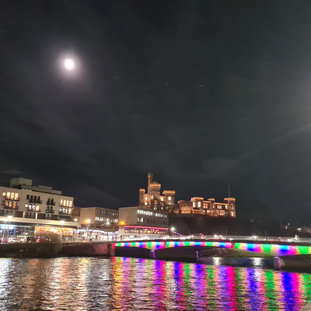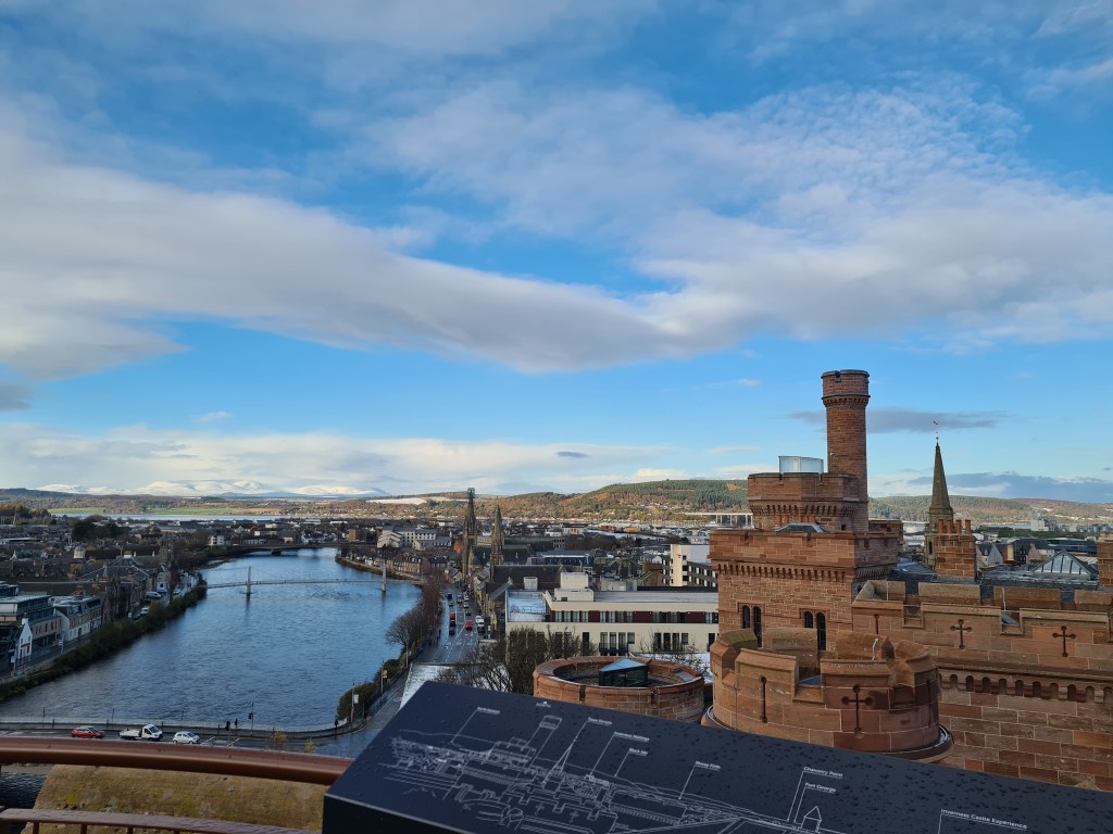 The picture above shows the castle at night, with its new lighting, sitting above the River Ness. Inside the Inverness Castle Experience it is also full of light and sound – and the views from the top are spectacular.