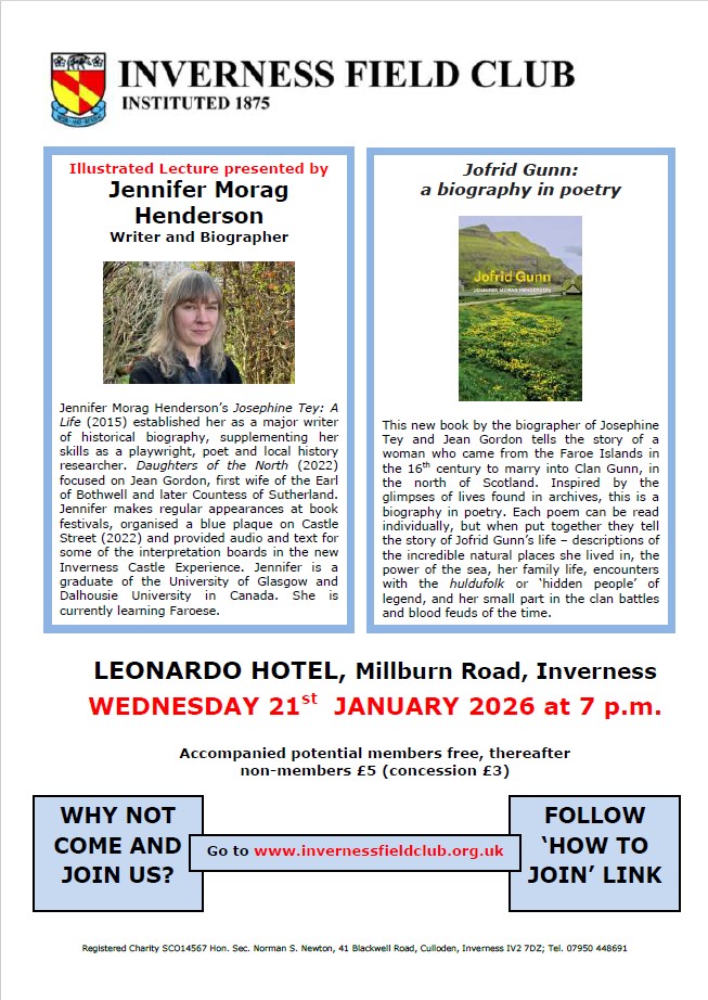 I am giving a talk to Inverness Field Club about my book “Jofrid Gunn” on Wednesday 21st January 2026, at 7pm, at the Leonardo Hotel on Millburn Road, Inverness. Details below: