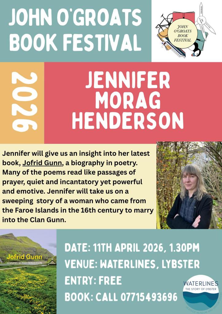 On Saturday 11th April, I will be speaking about my book “Jofrid Gunn” at Waterlines in Lybster. The event starts at 1.30pm and entry is free. To book a place, please call the number on the poster below:
